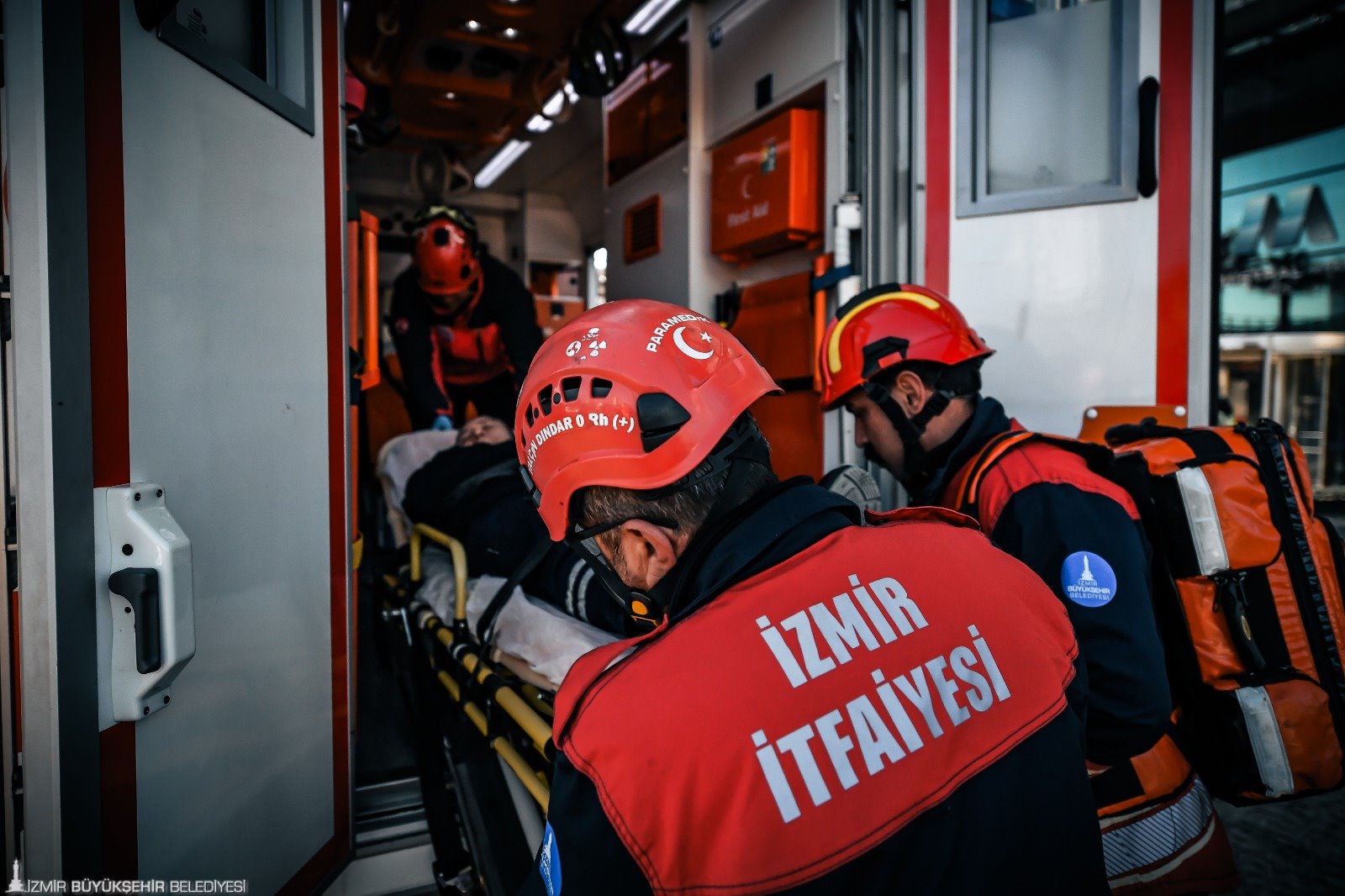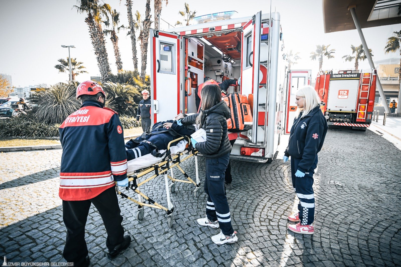 İzmir Büyükşehir Belediyesi İtfaiye ekipleri, Bayraklı’daki 47 katlı binada olası yangın ve acil durumlara karşı kapsamlı bir tatbikat gerçekleştirdi. Senaryoda çıkan yangında mahsur kalan bir personel güvenli şekilde kurtarıldı.
