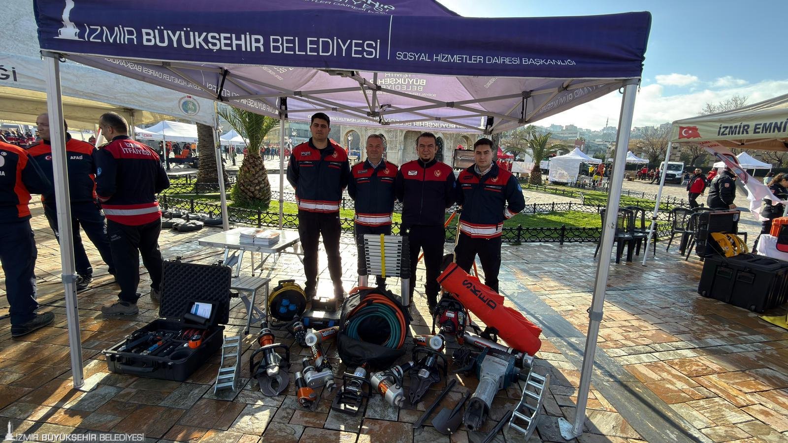 İzmir İl Afet ve Acil Durum Müdürlüğü (AFAD) koordinasyonunda gerçekleştirilen etkinlikte, İzmir Büyükşehir Belediyesi İtfaiyesi’nin sahada bizzat kullandığı ve enkaz altından can çıkardığı ekipmanlar sergilendi.