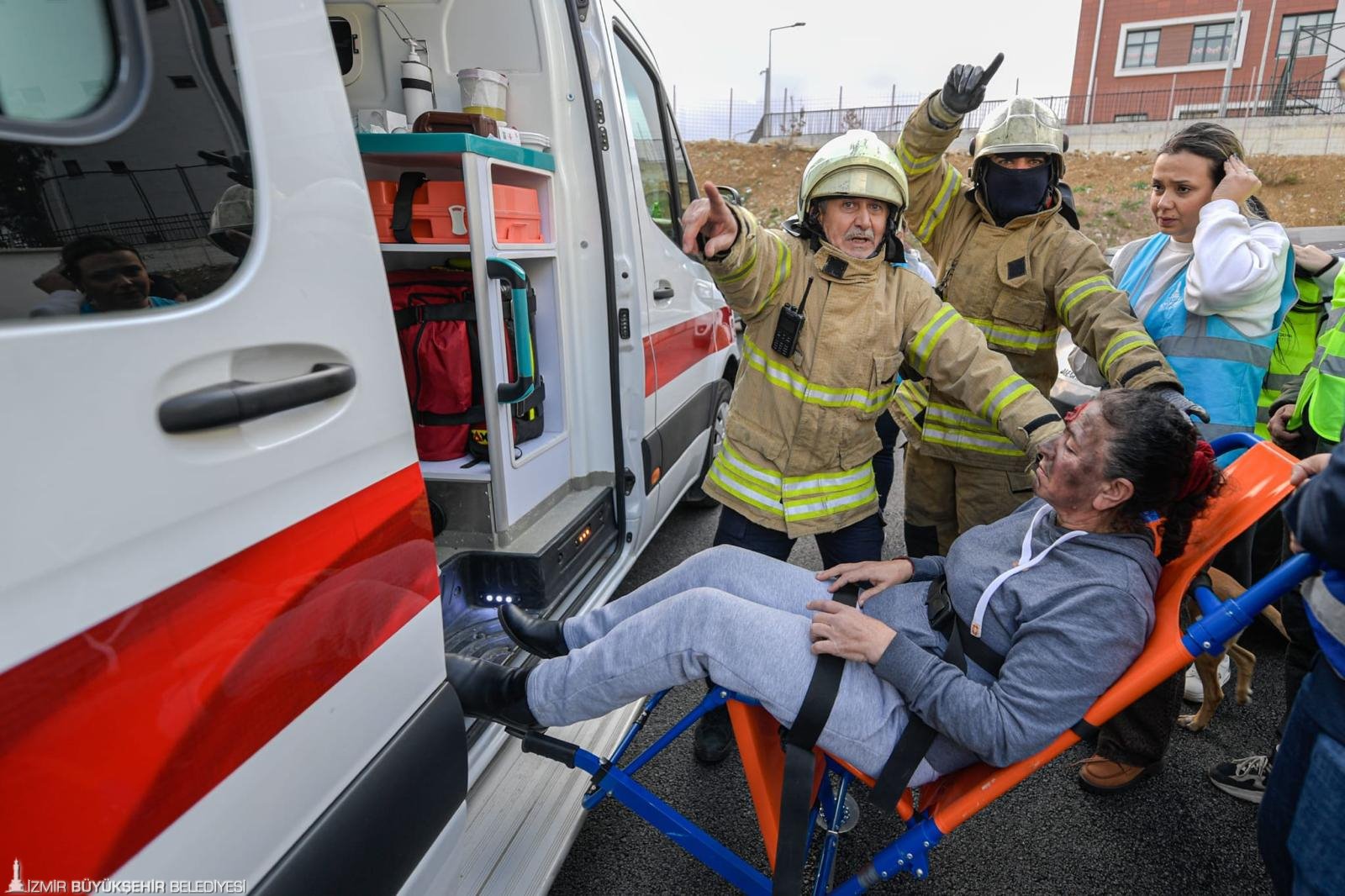 Olay yerine İzmir Büyükşehir Belediyesi İtfaiye Dairesi Başkanlığı ekipleri ile Eşrefpaşa Hastanesi’nden sağlık görevlileri yönlendirildi. Tatbikatta senaryo gereği ortopedik engelli Naime Bal ile down sendromlu Mert Boğaziçi yaralandı.