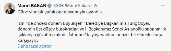 “Güne yine bir şafak operasyonuyla uyandık. İzmir’de önceki dönem Büyükşehir Belediye Başkanımız Tunç Soyer, dönemin üst düzey bürokratları ve İl Başkanımız Şenol Aslanoğlu sabahın ilk ışıklarıyla gözaltına alındı.