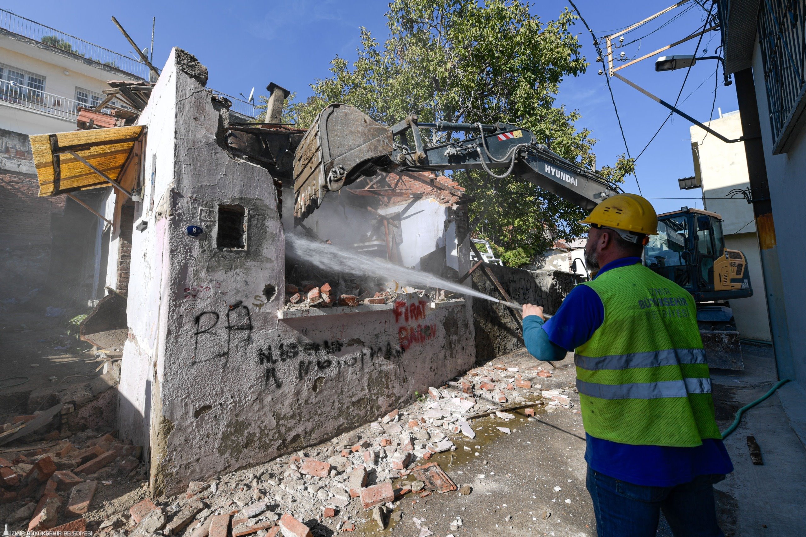 İzmir Büyükşehir Belediyesi, Ballıkuyu Kentsel Dönüşüm ve Gelişim Alanı içinde yer alan 1090 Sokak’taki güvenlik sorunu oluşturan terk edilmiş iki binayı yıktı.