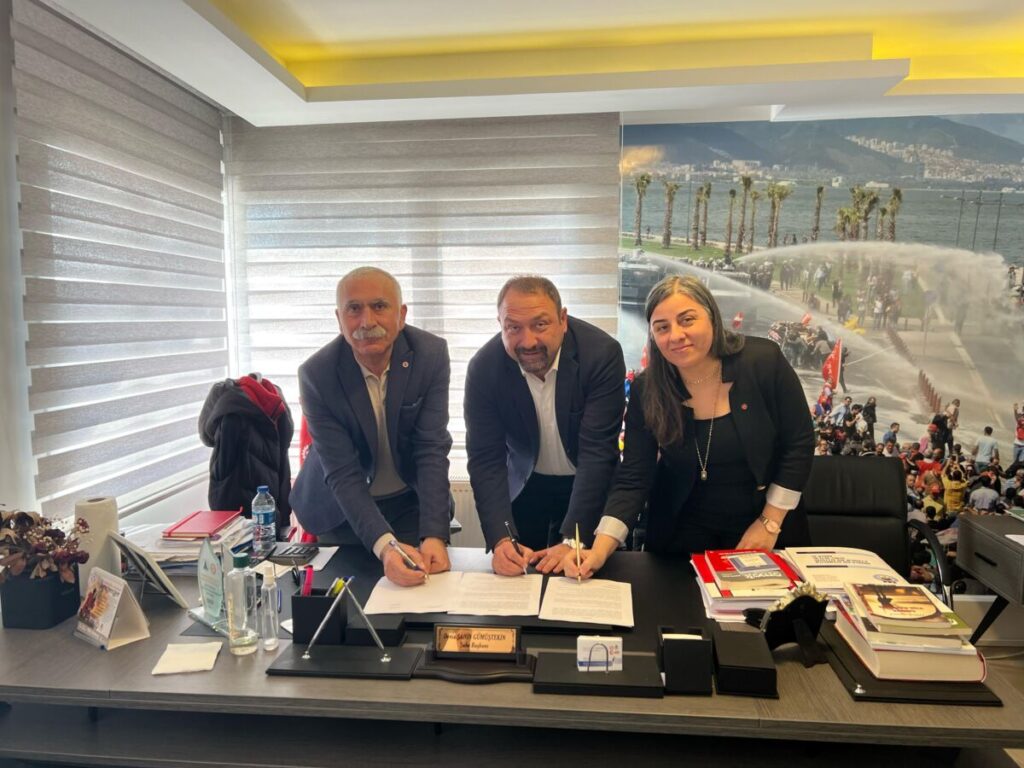 Çiğli Belediyesi şirketi ÇİBEL ile DİSK Ege Bölge Temsilcisi Memiş Sarı, iş yerinde örgütlü sendika DİSK Genel-İş İzmir 8 No’lu Şube Başkanı Deniz Şahin Gümüştekin, yönetimi ve temsilcilerin katılımı ile ek protokol imzalandı.