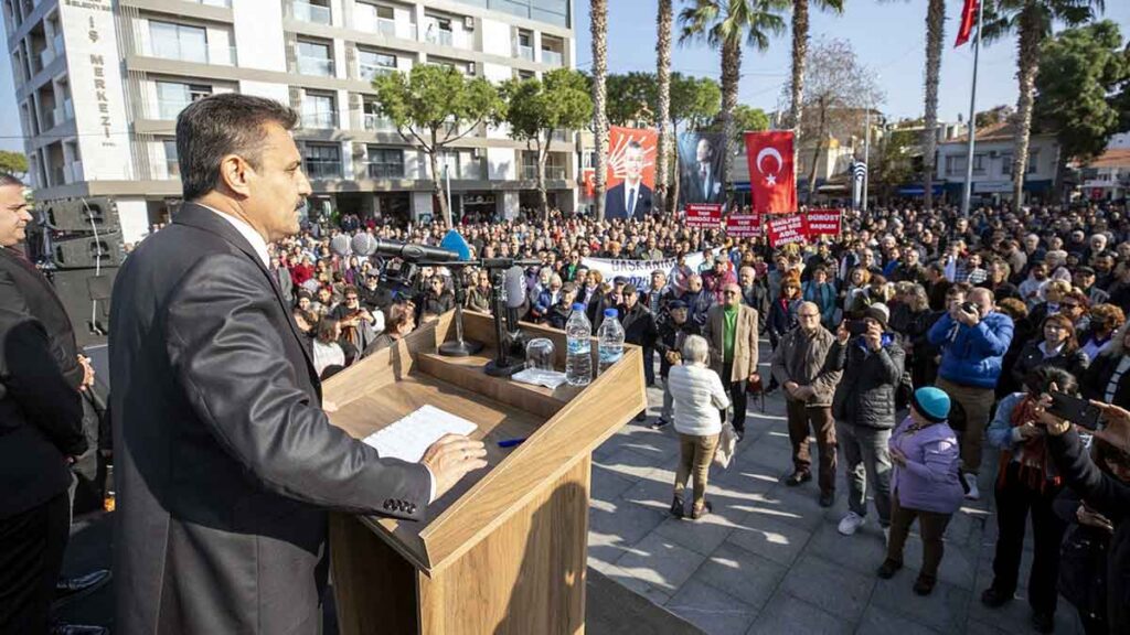 Dikili Belediye Başkanı Adil Kırgöz, Atatürk Meydanı’nda aday adaylığını açıklamak için toplantı düzenledi.