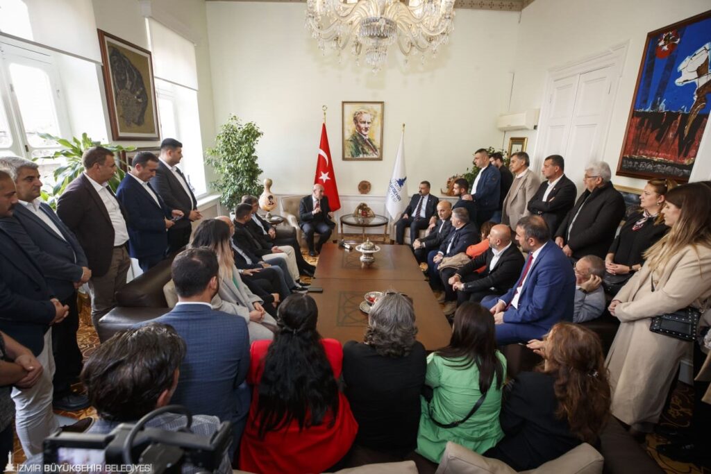 İzmir’in kurtuluşunun yıl dönümü kutlamalarında Atatürk’ün Nutuk kitabında yer alan sözleri alıntı yapmasıyla birlikte açılan soruşturma nedeniyle CHP İzmir İl Örgütü ve ilçe örgütleri Başkan Tunç Soyer’i makamında destek ziyaretinde bulundu.