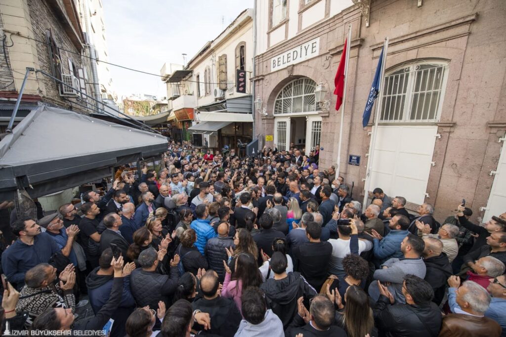 İzmir Büyükşehir Belediye Başkanı Tunç Soyer’e 9 Eylül İzmir’in kurtuluşunun 100’üncü yılı kutlamalarındaki konuşmasından dolayı İçişleri Bakanlığı tarafından açılan soruşturma sonrasında toplumun çeşitli kesimlerinden tepkiler gelmeye devam ediyor. CHP İzmir İl ve ilçe örgütlerinin üyeleri de destek için bir araya geldi. CHP İzmir İl Başkanı Şenol Aslanoğlu, İzmir Milletvekilleri Mahir Polat ile Yüksel Taşkın’ın da katıldığı ve başkanlık makamının yer aldığı İzmir Büyükşehir Belediyesi Egemenlik Evi önündeki buluşmada önemli mesajlar verildi. Başkan Soyer’e gönülden destek veren topluluk “Mustafa Kemal’in Askerleriyiz” ve “Hak Hukuk Adalet” sloganları attı.