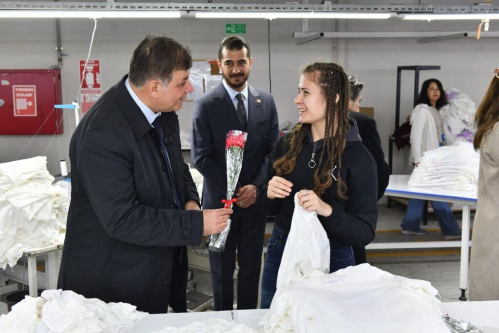 Eşi Öznur Tugay, CHP Aliağa Belediye Başkan Adayı Çağatay Güç ve eşi Gözde Güç ile Şakran’da, kadınların çalıştığı bir tekstil fabrikasını ziyaret eden Tugay, 8 Mart Dünya Emekçi Kadınları Günü nedeniyle çalışanlara karanfil verdi.