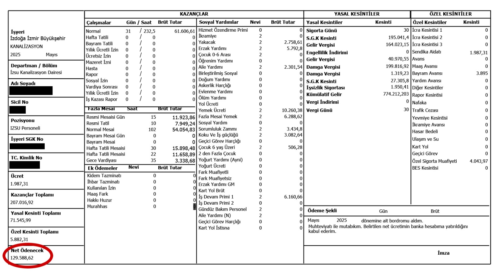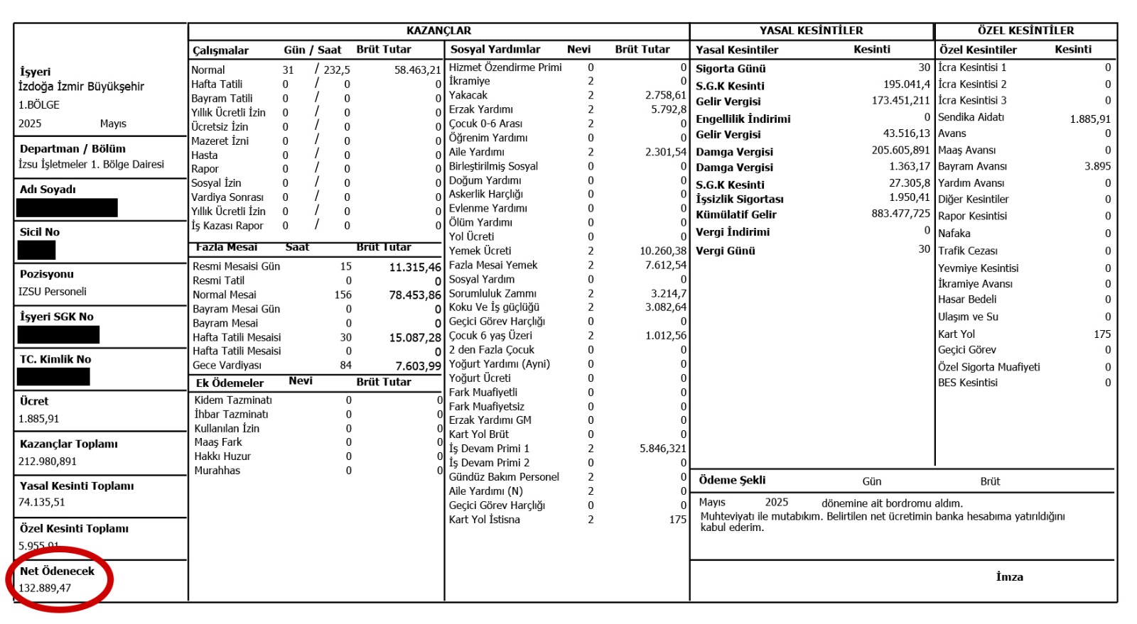 Sayın Ergün Atalay, tevatür ile somut gerçeğin farkını ekte sunduğum iki bordroyla fark edeceksiniz diye düşünüyorum. Bordrolarda, net ve brüt ücretleri görebilirsiniz. Bu da sizin için yeterli olmazsa, bordrolardaki “kümülatif gelir” kısmına bakıp ilgili aya bölerseniz (örneğin, mayıs bordrosunda 883 bin liralık kümülatif gelir, aylık 180 bin liraya tekabül eder ki) bunun aylık ortalama neti 130 bin liranın üzerinde olur. İtirazımız bu derece yüksek ücretin üzerine Eylül 2025’te gelecek zamdır, eylül zammından feragat istiyoruz” ifadelerini kullandı.