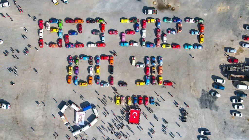 Araçlarla yapılan koreografide “1923-2023, 100. YIL” yazıldı. Başkan Sandal, kendi kullandığı araç ve yüzlerce vosvosla birlikte Bayraklı turu attı.