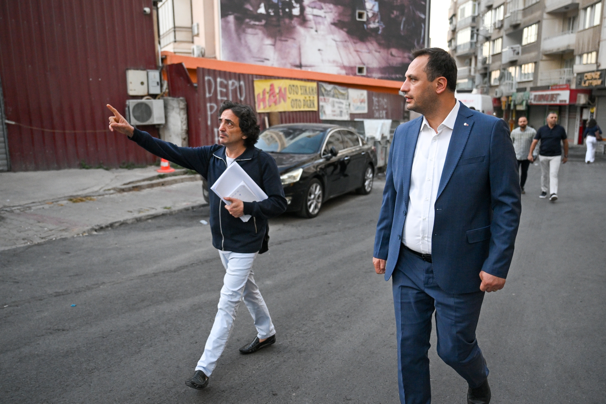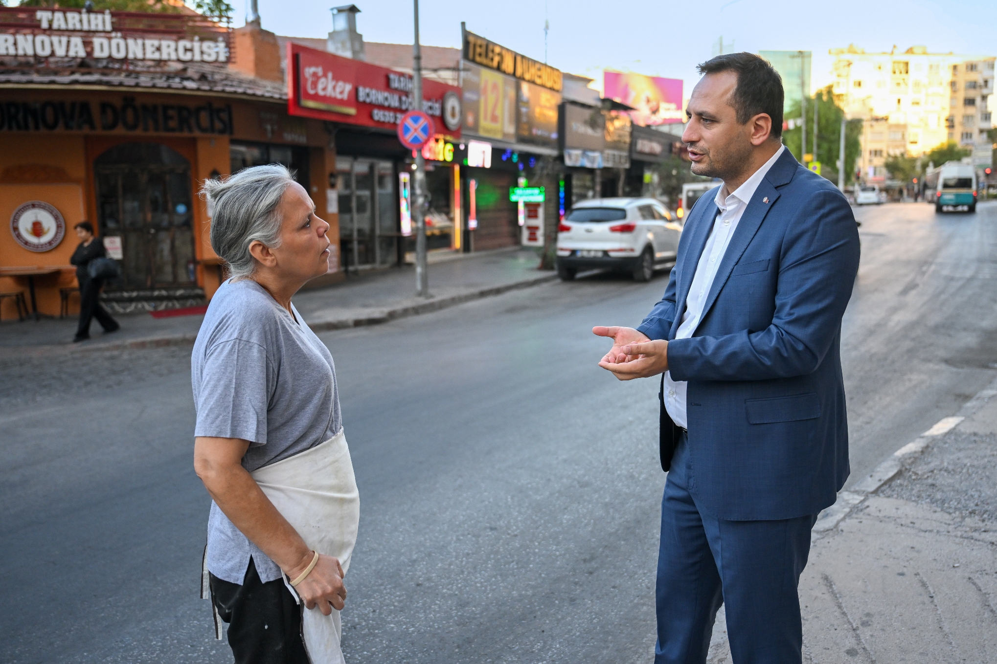 Bornova Belediye Başkanı Ömer Eşki, sabah mesaisine Mustafa Kemal Caddesi ve çevresindeki sokaklarda yapılan altyapı, asfalt ve peyzaj çalışmalarını inceleyerek başladı.