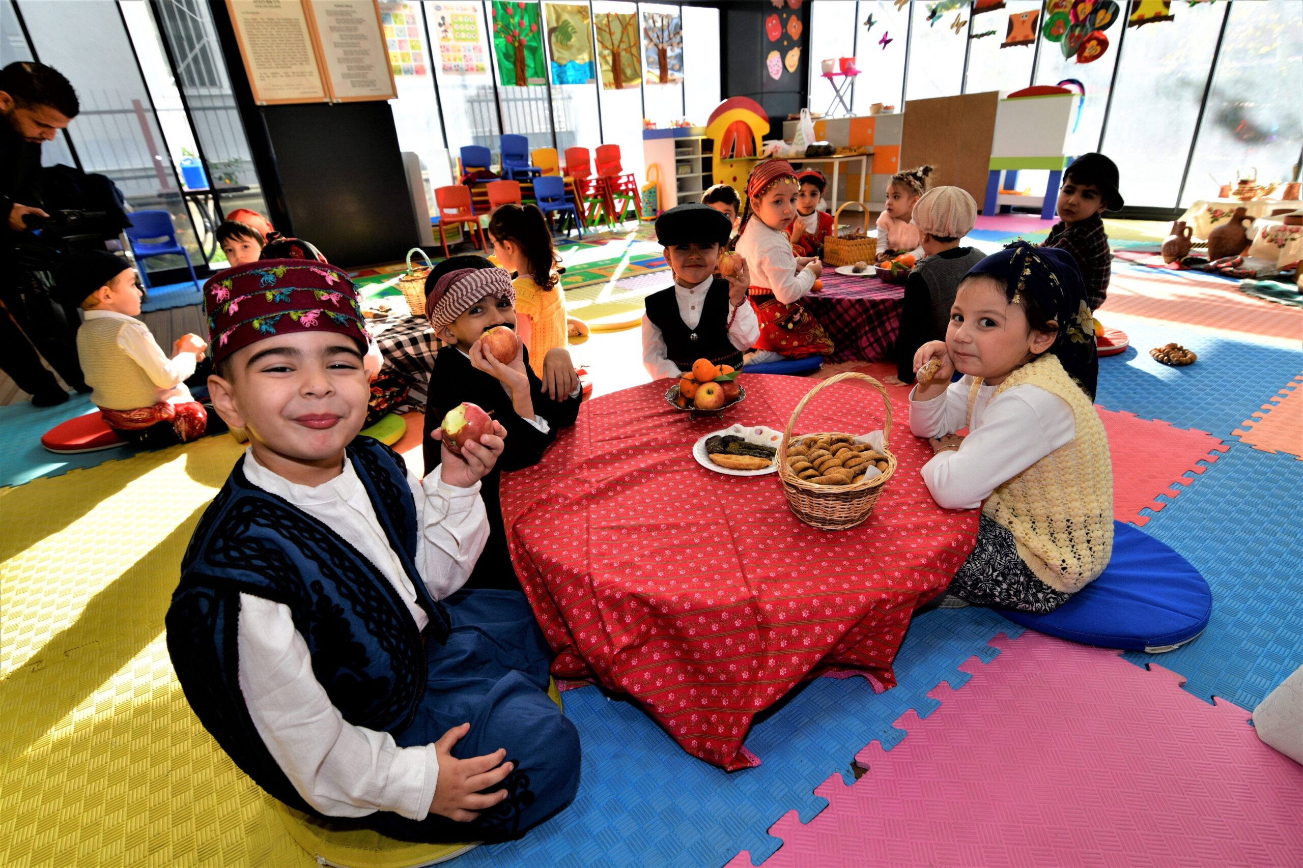 Merkezden yararlanan 3-6 yaş arası minikler, getirdikleri yiyeceklerin yetiştiği yörelere ait kıyafetler giyerek yerli üretimin önemine dikkat çekti.