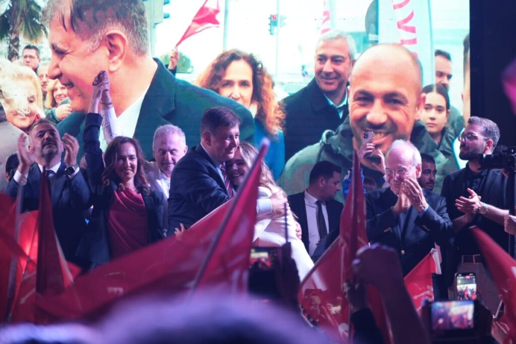 İzmir Büyükşehir Belediye Başkanı Cemil Tugay, beraberinde ilçe belediye başkanları, CHP İzmir İl Başkanı Şenol Aslanoğlu, CHP Genel Başkan Yardımcısı Murat Bakan, CHP İzmir Milletvekili Sevda Erdan Kılıç olduğu halde sahneye çıktı.