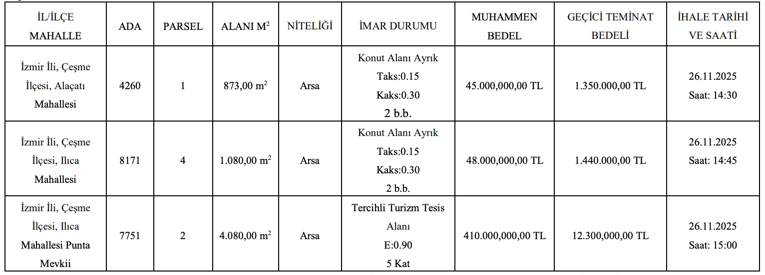 Satışa çıkarılacak taşınmazların, Çeşme’nin en değerli iki bölgesinde konumlandığı belirlendi. İlana göre; Alaçatı Mahallesi’nde 1, Ilıca Mahallesi’nde ise 2 arsa niteliğindeki taşınmaz, yatırımcıların beğenisine sunulacak. Her iki bölgenin de turizm potansiyeli ve emlak değeri göz önüne alındığında, satışların yoğun ilgi görmesi bekleniyor.