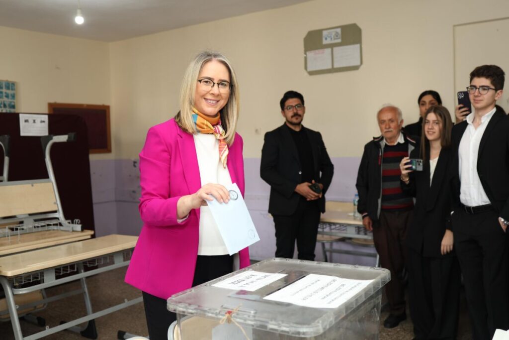 AK Parti Konak Belediyesi Başkan Adayı Ceyda Bölünmez Çankırı, İzmir Konak Osman Kibar Ortaokulu’nda Mahalli İdareler Genel Seçim için oyunu kullandı.