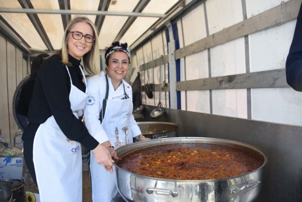 “Sosyal medya hesaplarından anlattık. Dedik ki biz herkes için yemek pişiriyoruz, herkese kapımız açık. Dolayısıyla büyük bir gönül sofrası kuruduk. Burada yapılan yemekler, sabah saat 08.00’den itibaren mahallelerde dağıtılmaya başlandı. 4 mahallede dağıtılıyor. Her bir mahalleye bin ve 1500 kişilik yemekler dağıtılıyor. Akşam da Cumhuriyet Meydanı’nda ayrıca bin kişilik bir iftar yemeği vermiş olacağız. Burada önemli olan yemek pişirmek değil yemeği birlikte pişirmek. Her kesimden insanın bir başkası için bir şeyler yapabilmesi çok önemli. Dolayısıyla biz de bunun arkasındayız, Ceyda Hanım da bunun çok iyi bir temsilcisi. Birçok dinden ve kültürden insanın bir arada yaşadığı çok kültürlülükten geldiği için birleştirme ruhu onda var. Hepimizi burada birleştirdi. Çok güzel bir mutfaktan çok güzel yemekler çıktı. Bugün ihtiyaç sahiplerine gönderildi.”