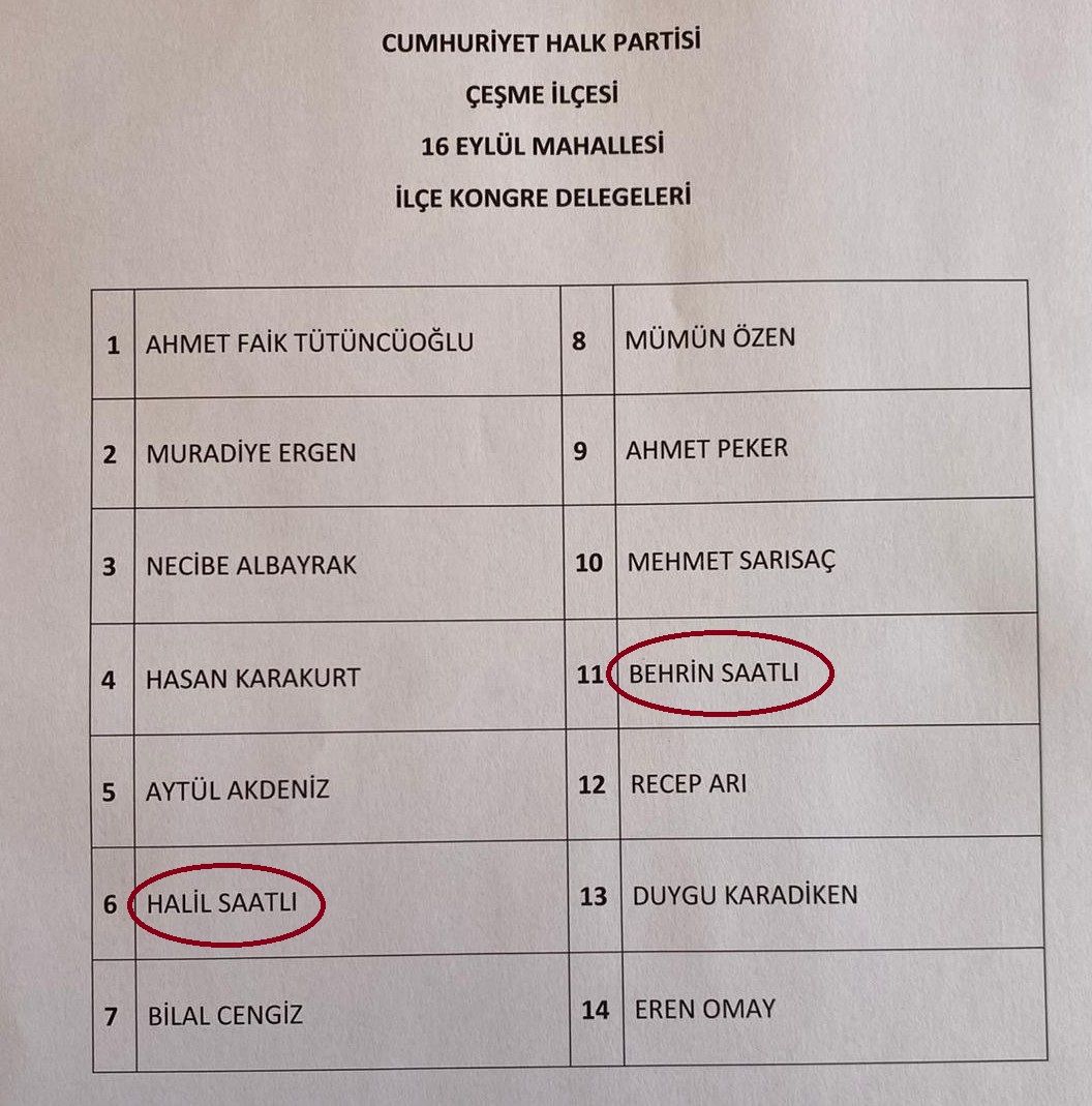 Delege seçimlerinin sembolik bir formaliteye dönüştüğü eleştirileri CHP Çeşme İlçe Örgütü’nde somutlaştı. Belediye Meclis Üyesi Onur Saatli’nin, annesini, babasını, eşini ve kuzenini farklı mahallelerden delege olarak yazdırdığı öğrenildi. Saatli’nin yanı sıra diğer meclis üyelerinin de benzer şekilde eş, çocuk ve kardeşlerini listelere dahil ettiği ortaya çıktı.