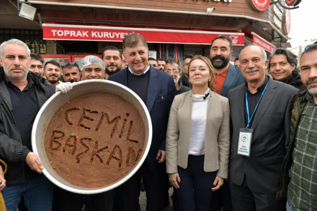 CHP İzmir Büyükşehir Belediye Başkan Adayı Dr. Cemil Tugay, İzmir Şanlıurfalılar Federasyonu, İzmir Bingöllüler Derneği ve Defne Eğitim ve Yaşam Derneği’ni ziyaret etti. Şanlıurfalılar kendisine üzerinde adının yazıldığı bir tepsi çiğköfte ile sürpriz yaptı.