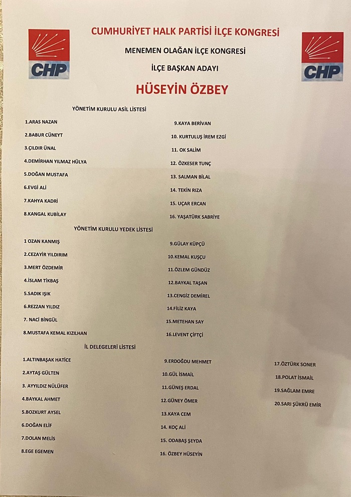 Hüseyin Özbey 201 delegenin oyunu alırken, rakibi Sadık Tanrıverdi ise 182 oy aldı. CHP Menemen İlçe Başkanı Hüseyin Özbey oldu.
