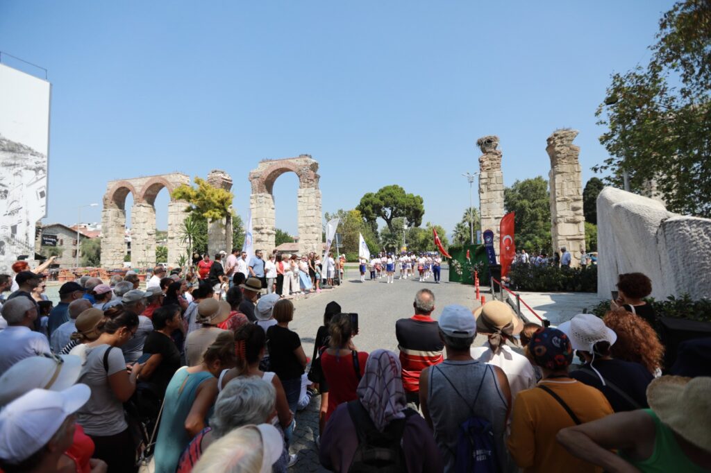 Efes Selçuk Belediyesi Zeybek Ekibi gösterisinin ardından tüm katılımcılar bir katılımcılar saat 12.30’da Ulu Önder Mustafa Kemal Atatürk’ün silüetinin Kurtuluş Yolu Anıtı’nda görülmesine bir kez daha heyecanla ve duygulanarak tanık oldular.