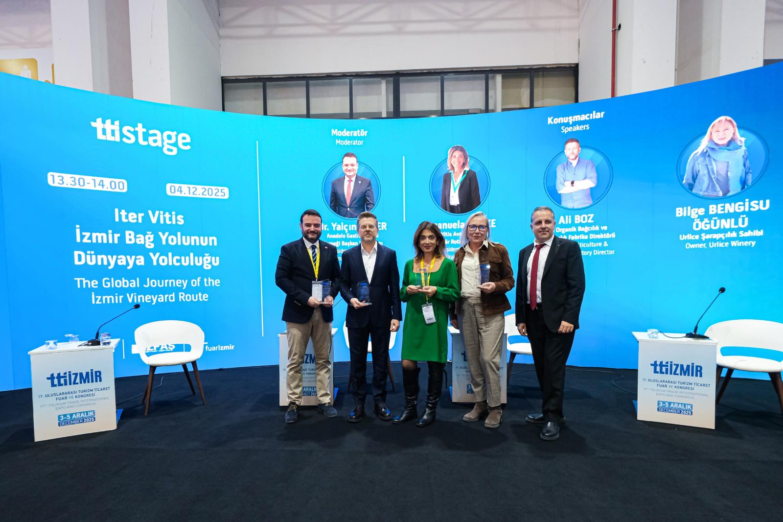 Fuar kapsamında gerçekleştirilen “ITER VITIS-İzmir Bağ Yolunun Dünyaya Yolculuğu” başlıklı oturumda ise bağcılık mirasının uluslararası kültür rotaları içindeki yerini odağına aldı. Anadolu Gastronomi Turizmi Derneği’nden Yalçın Güçer’in moderatörlüğünde düzenlenen oturumda; Iter Vitis Avrupa Konseyi Kültür Rotası Başkanı Emanuela Panke, LA Organik Bağcılık ve Şarapçılık Fabrika Direktörü Ali Boz ile Urlice Şarapçılık Sahibi Bilge Bengisu Öğünlü konuşmacı olarak yer aldı. Oturumda, İzmir Bağ Yolu’nun Avrupa Konseyi tarafından tescillenen Iter Vitis Kültür Rotası ağı içerisine de alındığı hatırlatılarak, stratejik konumu, sürdürülebilir bağcılık uygulamaları, şarap turizminin gelişimi ve yerel ekonomiye sağladığı katkılar kapsamlı biçimde konuşuldu. Oturumda; binlerce yıllık bağcılık geçmişiyle Anadolu’nun önemli üretim merkezlerinden biri olan İzmir’in, kültür rotaları aracılığıyla uluslararası turizm ağlarına daha güçlü entegre olma potansiyeline sahip olduğu vurgulandı. Konuşmacılar, İzmir Bağ Yolu’nun, yalnızca bir turizm destinasyonu değil aynı zamanda gastronomi, kültür, kırsal kalkınma ve sürdürülebilir turizmi bir araya getiren bütüncül bir deneyim rotası sunduğuna dikkat çekti.