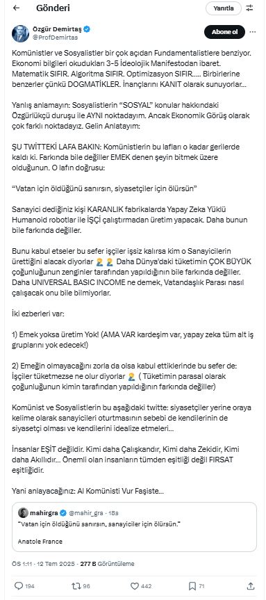 DEMOKRAT GÜNDEM-Ekonomist Prof. Dr. Özgür Demirtaş, sosyal medya hesabından yaptığı paylaşımda sosyalist ve komünistlerin ekonomi anlayışını hedef aldı.