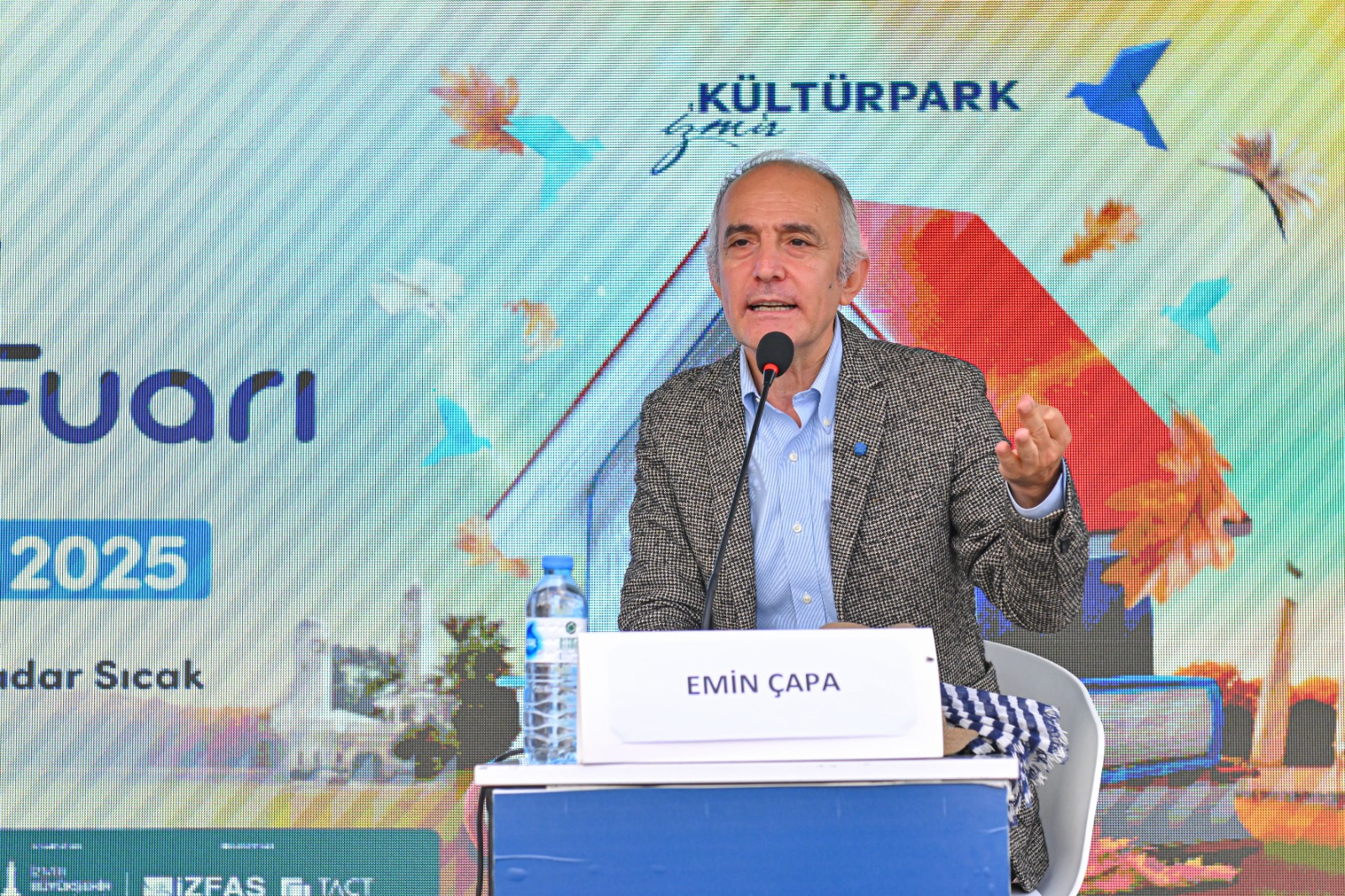 Uzun Havut Etkinlik Alanı’nda gerçekleştirilen “Edebiyatın Merceğinde Türkiye ve Dünya” başlıklı söyleşiye “Böyle yağmurlu bir günde İzmir’e bereket getirdik. Burada olmak insanı çok iyi hissettiriyor” diyerek başlayan Emin Çapa, kitapseverlerle buluşmaktan büyük mutluluk duyduğunu belirtti.