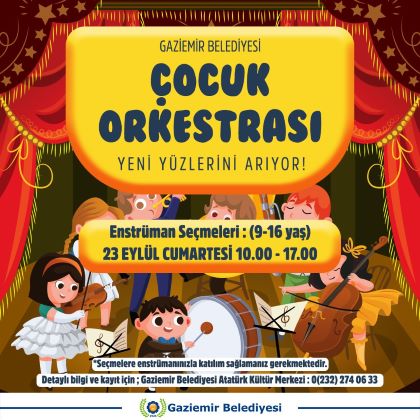 Belediyenin çocuklara sanatı sevdirmek ve müzik alanında yetenekli olanları desteklemek amacıyla kurduğu Gaziemir Belediyesi Çocuk Orkestrası’na katılacak yeni üyelerin seçmeleri yapılacak.