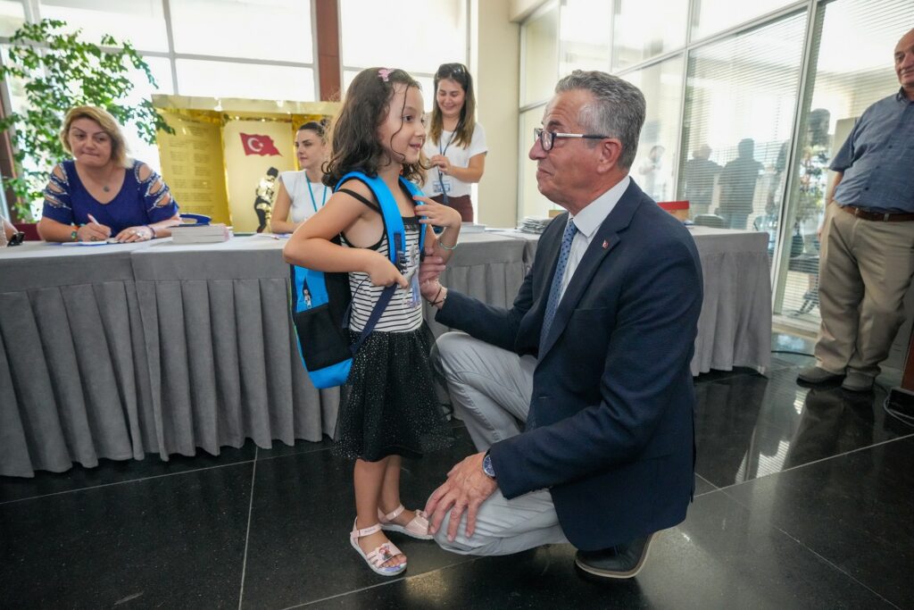 Öğrencilere çantalarını vererek onların mutluluğuna ortak olan Belediye Başkanı Halil Arda, “Çocuklarımızın heyecanına ortak olmak, ülkemizin içinde bulunduğu ekonomik krizle boğuşan yurttaşlarımıza bir nebze olsun katkıda bulunmak için ilçemizdeki devlet okullarında ilkokula başlayacak tüm birinci sınıf öğrencilerine okul çantası armağan ediyoruz.