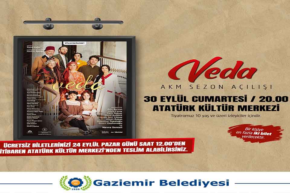 Veda oyunu 30 Eylül Cumartesi günü saat 20.00’de Gaziemir Atatürk Kültür Merkezi’nde sahnelenecek.
