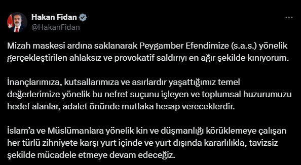 “Mizah maskesi ardına saklanarak Peygamber Efendimize (s.a.s.) yönelik gerçekleştirilen ahlaksız ve provokatif saldırıyı en ağır şekilde kınıyorum.”