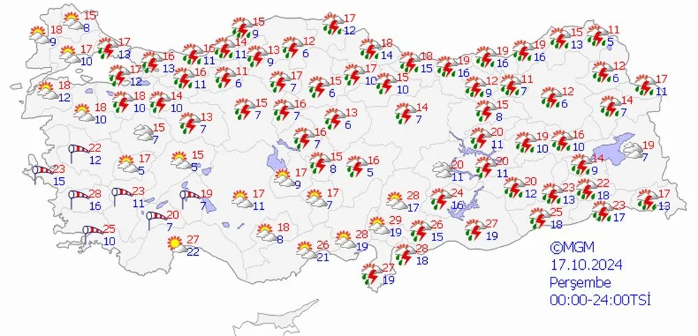 Parçalı ve az bulutlu geçeceği tahmin ediliyor. Rüzgârın, kıyı kesimlerinde kuzeyli yönlerden kuvvetli (40-60 km/sa) olarak esmesi bekleniyor. Sabah ve gece saatlerinde iç kesimlerinde yer yer sis ve pus olayı bekleniyor.A.KARAHİSAR °C, 15°C