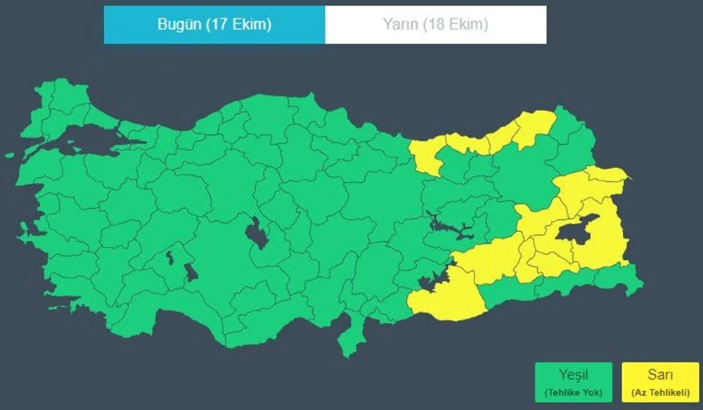 Meteoroloji tarafından bugün 13 il için sarı kodlu yağış uyarısı yapıldı. Ağrı, Artvin, Bitlis, Diyarbakır, Giresun, Muş, Rize, Siirt, Trabzon, Şanlıurfa, Van, Batman ve Iğdır’da vatandaşlardan sel ve su baskınlarına karşı dikkatli olunması istendi.