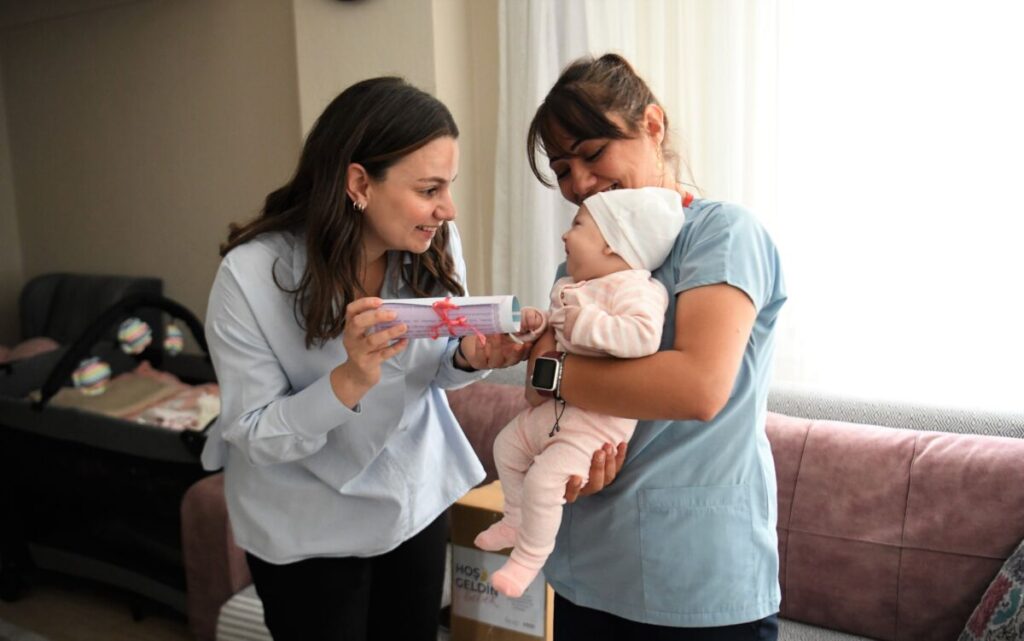 Aynı zamanda hatıra niteliği taşıyan hediye paketi ile birlikte Bornova Belediye Başkanı Ömer Eşki’nin “Dünyamıza, Bornovamıza hoş geldin” dediği mektup da ailelere iletiliyor. Ailelerin izni doğrultusunda gerçekleşen ziyaretlere katılan Başkan Eşki’nin Eşi Beste Eşki anne ve babaların heyecanına ortak oluyor.