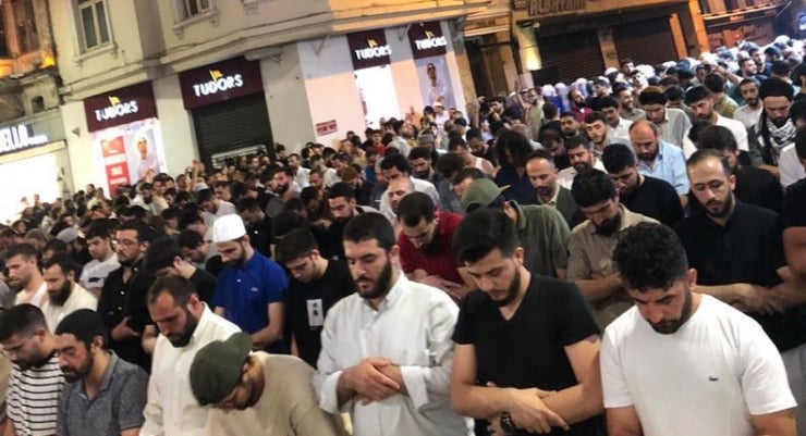 LeMan dergisinin Beyoğlu’ndaki binası önünde toplanan grup, “Kemalist köpekler hesap verecek”, “Yaşasın Şeriat” gibi sloganlar atıp tekbir getirmeyi sürdürüyor. Grubun yatsı namazını da İstiklal Caddesi’nde kıldığı görüldü. Bölgede güvenlik önlemleri artırılırken, olası bir gerginliğe karşı çok sayıda polis ekibi hazır bekletiliyor.