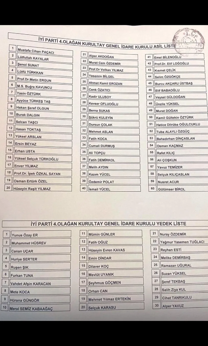 İYİ PARTİ 4. OLAĞAN KURULTAY GENEL İDARE KURULU YEDEK LİSTE: