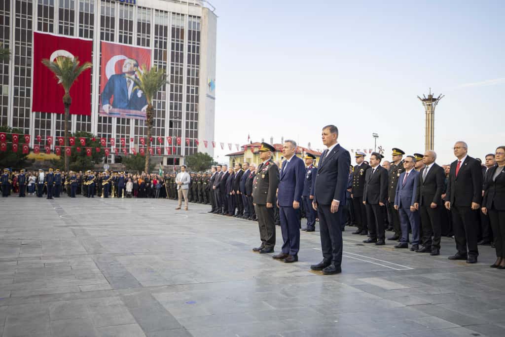 Törene; İzmir Valisi Süleyman Elban, Ege Garnizon Komutanı Orgeneral İrfan Özsert, İzmir Büyükşehir Belediye Başkanı Cemil Tugay’ın yanı sıra, siyasi parti temsilcileri, iş dünyası temsilcileri, resmi kurumlar ve sivil toplum kuruluşlarının temsilcileri katıldı. Atatürk Anıtı’na çelenklerin sunulduğu tören, saygı duruşu ve İstiklal Marşı’nın okunmasıyla devam etti.