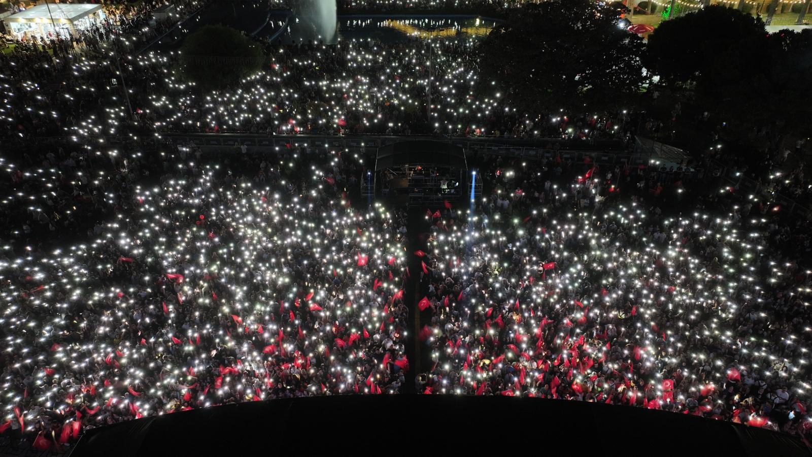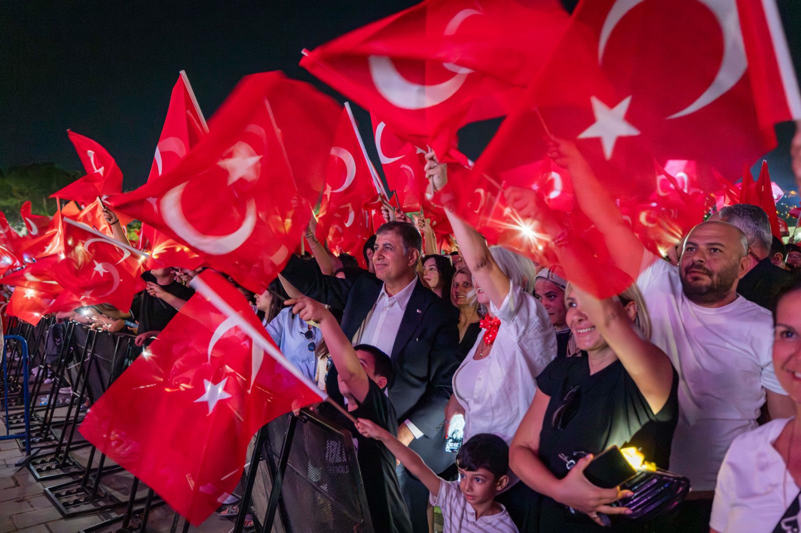Konserde Ali Altay’ın söylediği şarkılara Başkan Tugay ve İzmirliler, Türk bayraklarını dalgalandırarak eşlik etti. Ali Altay’ın ricası üzerine cep telefonlarının ışıklarını yakan İzmirliler, konser alanını ışık şovuna dönüştürdü.