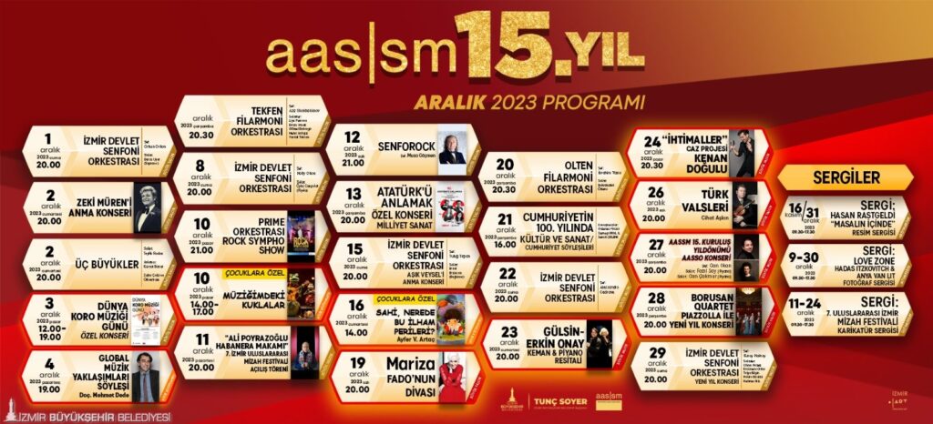 11 Aralık’ta İzmir Uluslararası Mizah Festivali açılış töreninde Ali Poyrazoğlu Habanera Makamı ile 21 Aralık’ta gazeteci yazar Zeynep Oral ve yazar Semih Çelenk ”Cumhuriyetin 100. Yılında Kültür ve Sanat” söyleşisiyle AASSM’de yer alacak.