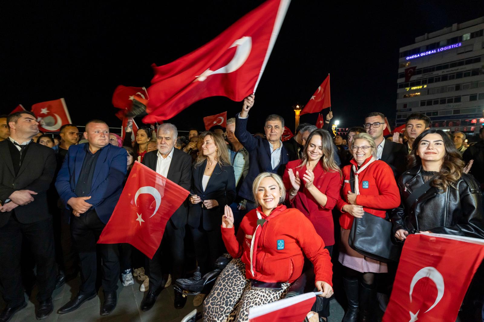 İzmirlilerin bayramını kutlayan İzmir Büyükşehir Belediye Başkanı Dr. Cemil Tugay, “Cumhuriyeti çok seviyoruz. İzmir Cumhuriyeti çok seviyor. Bugün ona olan sevgimizi göstermek için bütün gün törenlerde, kutlamalarda hep birlikte yer aldık. Güzel ülkemizi, güzel ülkemizin güzel insanlarını çok seviyoruz. Çok güzel şeyler hak ettiklerini biliyoruz. Herkesin bayramı kutlu olsun” dedi.