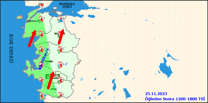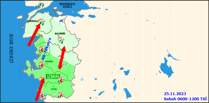 Rüzgarın, İzmir’de güney-güneybatı yönlerden fırtına (50-75 km/sa), Cumartesi gece saatlerinde kıyı kesimleri ile yüksek rakımlı yerlerde zaman zaman kuvvetli fırtına (60-90 km/sa) şeklinde; Cumartesi öğle saatlerinden sonra güney-güneybatı yönlerden Aydın ve Manisa’da fırtına (40-75 km/sa) şeklinde; Çanakkale’de Cumartesi ilk saatlerden itibaren güney-güneybatı yönlerden fırtına (50-75 km/sa), batı kıyılarında ve yüksek rakımlı yerlerde zaman zaman kuvvetli fırtına (60-90 km/sa) şeklinde; Balıkesir’de ise Cumartesi sabah saatlerinden itibaren güney-güneybatı yönlerden fırtına (50-75 km/sa), Cumartesi gece saatlerinde kuzey ve batı kıyıları ile yüksek rakımlı yerlerde zaman zaman kuvvetli fırtına (60-90 km/sa) şeklinde eseceği tahmin edildiğinden bölgemizde yaşanabilecek ulaşımda aksamalar, çatı uçması, ağaç ve direk devrilmesi, baca gazı zehirlenmesi gibi olumsuzluklara karşı dikkatli ve tedbirli olunması gerekmektedir.