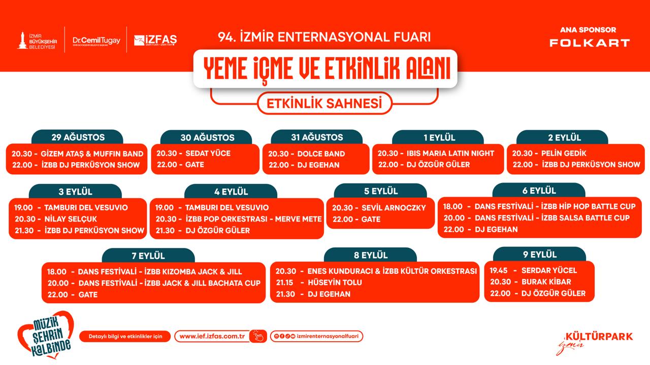 Bu yıl yenilenen Yeme-İçme ve Etkinlik Alanı da dopdolu bir sahne programı ile ziyaretçilere festival havası yaşatacak. 19.00-21.00 saatleri arasında sahneye çıkacak isimler arasında Gizem Ataş&Muffin Band, Sedat Yüce, Dolce Band, Ibis Maria Latin Night, İtalyan müzik grubu Tamburi Del Vesuvio, Nilay Selçuk, Sevil Arnoczky ve Burak Kibar gibi sanatçılar yer alacak. Ayrıca İzmir Büyükşehir Belediyesi Pop Orkestrası ve Kültür Orkestrası da özel performanslarıyla fuar atmosferini renklendirecek. Renkli konserleri DJ performansları tamamlayacak. 6–7 Eylül tarihlerinde ise Dans Festivali Yarışmaları, salsa, bachata ve kizomba tutkunlarını bir araya getirecek.