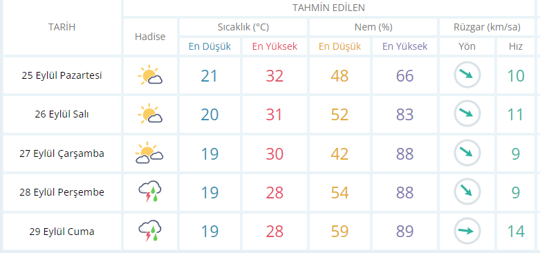 Hafta ilerledikçe, sıcaklık artışının yanı sıra nem oranları da yükselecek. Salı günü hava hala az bulutlu olacakken Çarşamba günü parçalı bulutlu bir hava bekleniyor. Özellikle Çarşamba günü nem oranlarının yüzde 88’e kadar çıkmasıyla yağmur ihtimali artacak.