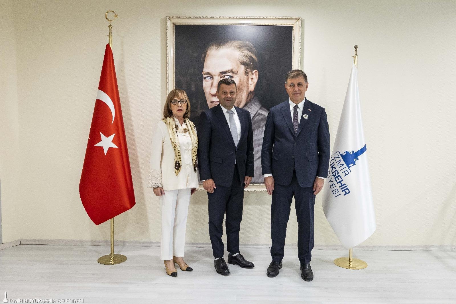 Ziyaretin sonunda Başkan Tugay Büyükelçi Mirsada Colakovic’e İzmir’in sembolü Saat Kulesi’nin yer aldığı tablo ve yerel ürünlerden oluşan hediye paketi takdim etti.