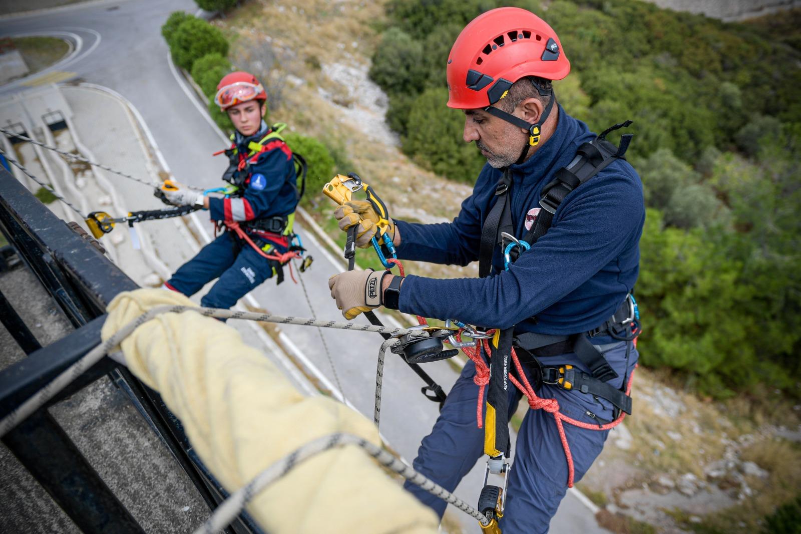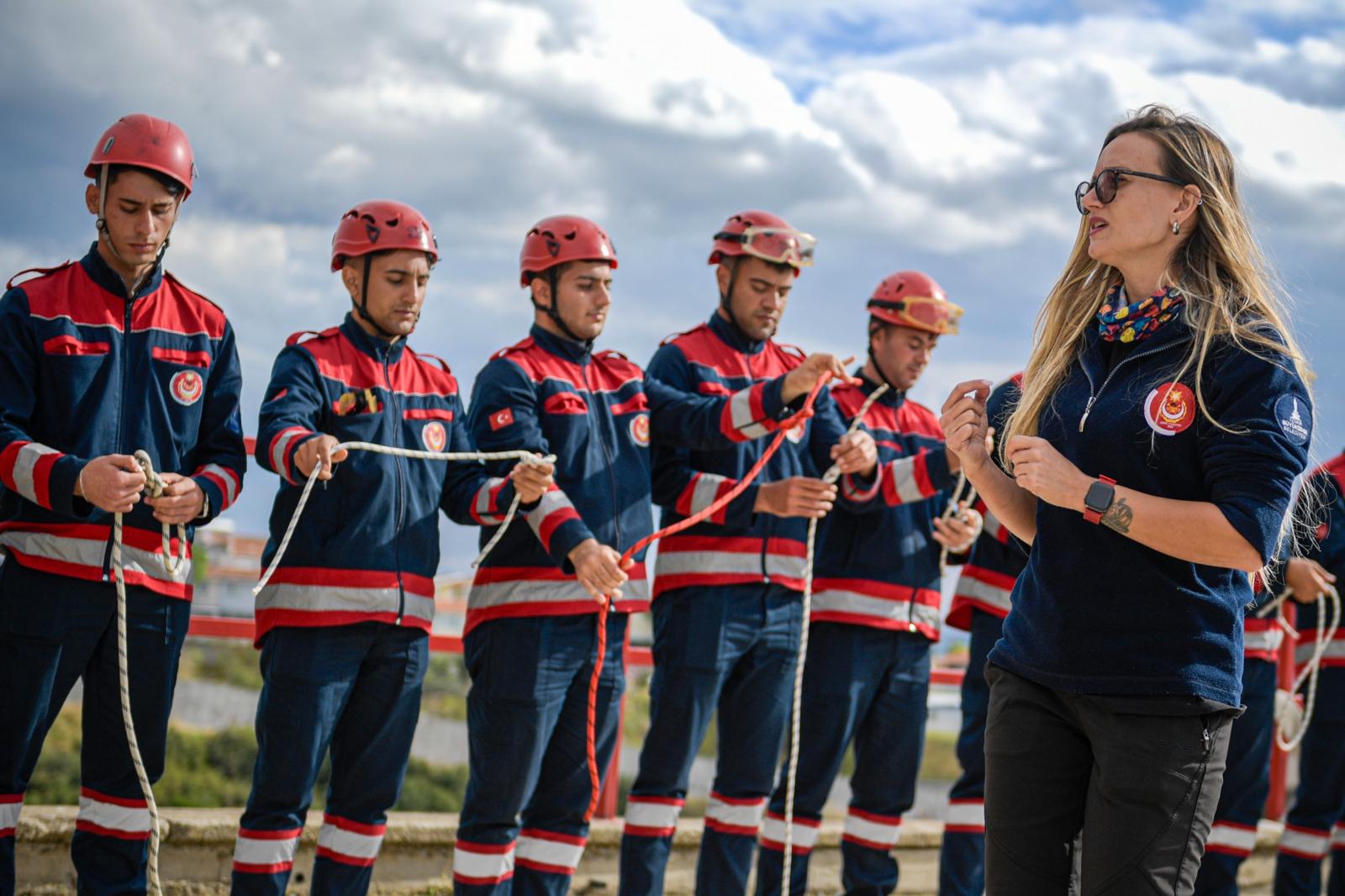 Topal, “Mesleğe yeni başlayan itfaiyeci arkadaşlarımıza basit istasyon kurulumu, yük dağılımı istasyon kurulumu, kullandığımız iplerin özellikleri hakkında eğitim veriyoruz. Teorik eğitimlerin ardından uygulamaya geçiyoruz. 15 metrelik kuleden aşağıya seri şekilde iniş ve tekrar yukarı tırmanma pratiği yapıyoruz.