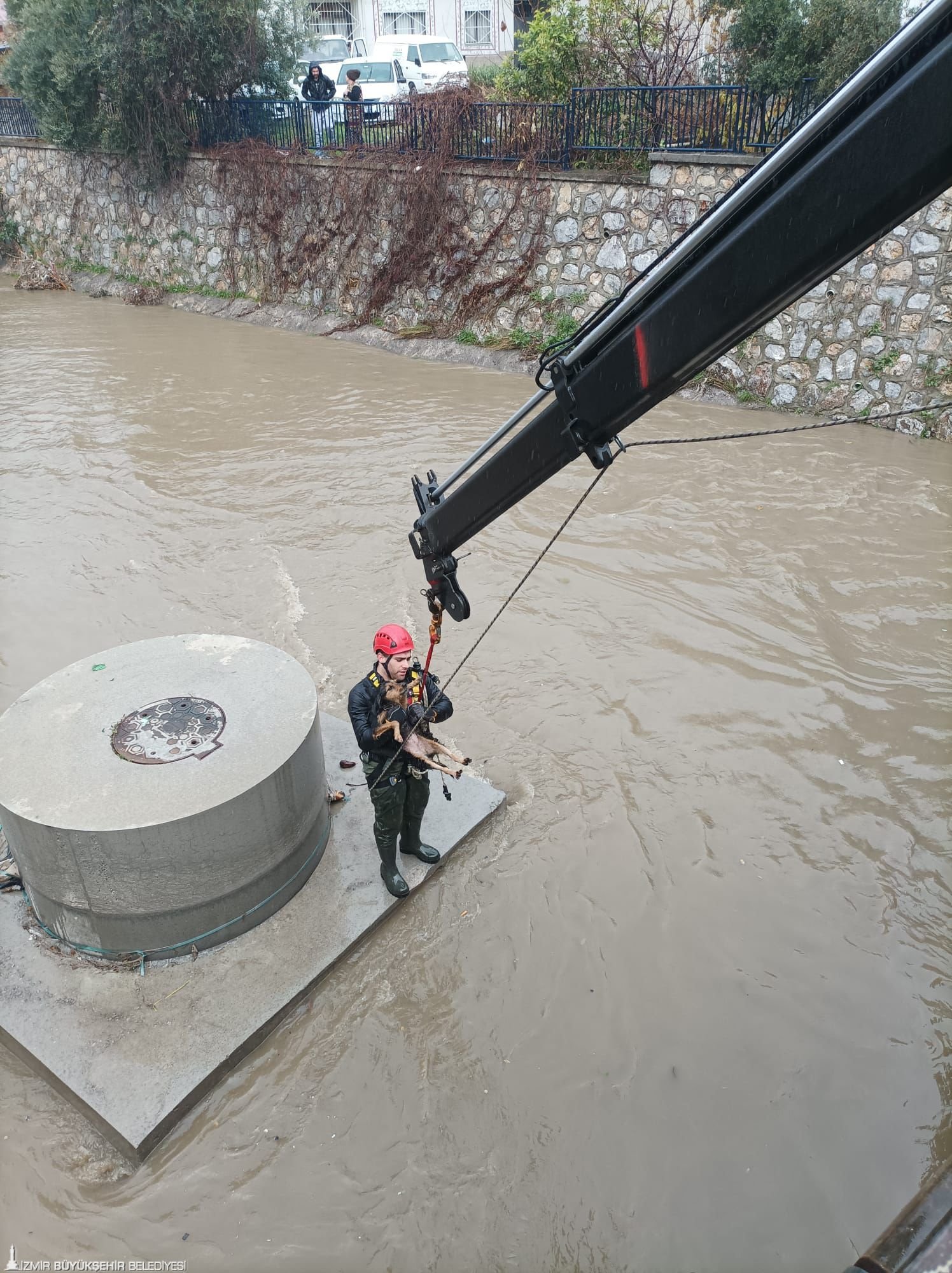 Mahalle sakinleri, dere yatağından gelen sesler üzerine bölgeye gittiklerinde, bir köpeğin suya düştüğünü ve yükselen akıntı nedeniyle kendi çabalarıyla çıkamadığını fark etti.