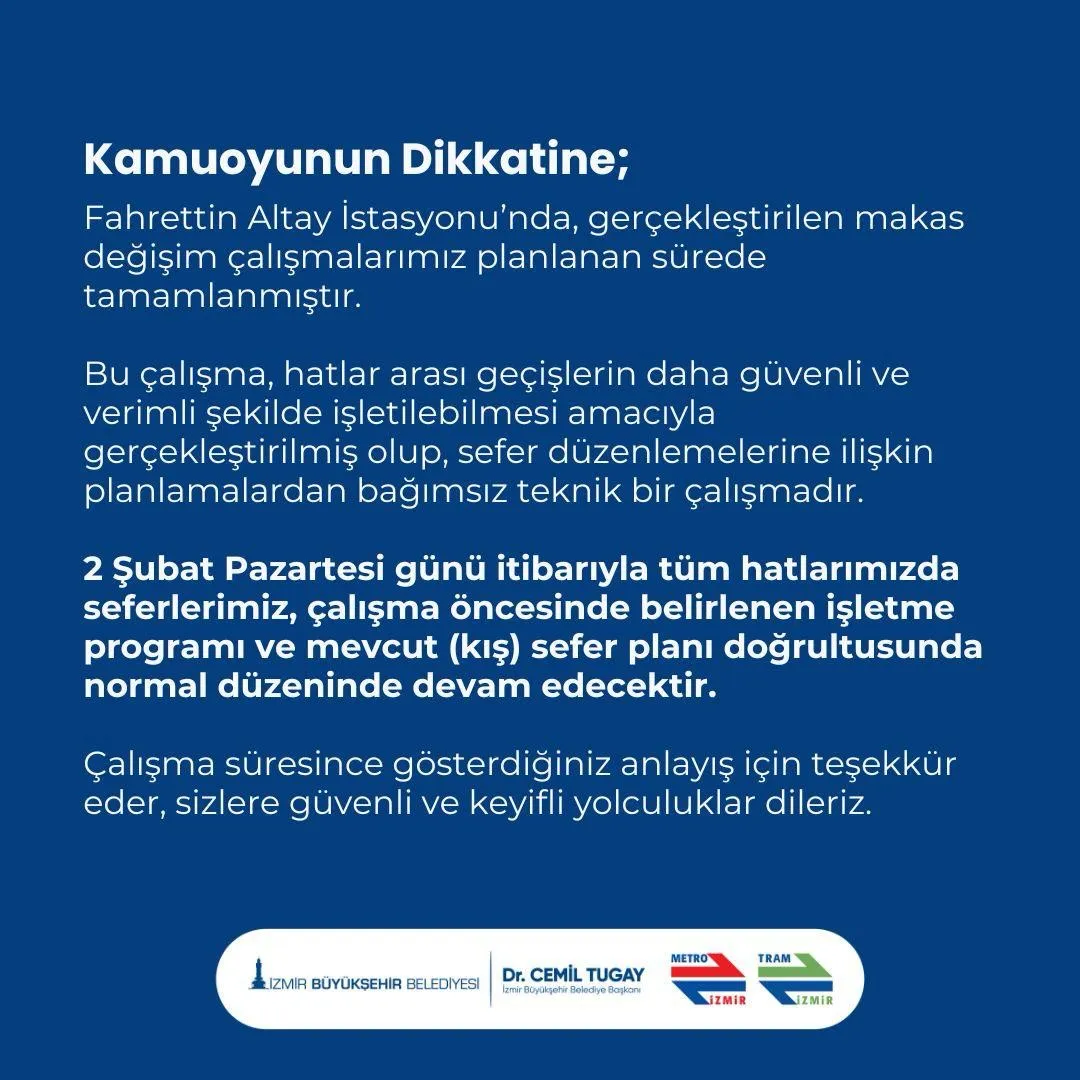 “Fahrettin Altay İstasyonu’nda gerçekleştirilen makas değişim çalışmalarımız planlanan sürede tamamlanmıştır. Bu çalışma, hatlar arası geçişlerin daha güvenli ve verimli şekilde işletilebilmesi amacıyla gerçekleştirilmiş olup, sefer düzenlemelerine ilişkin planlamalardan bağımsız teknik bir çalışmadır.