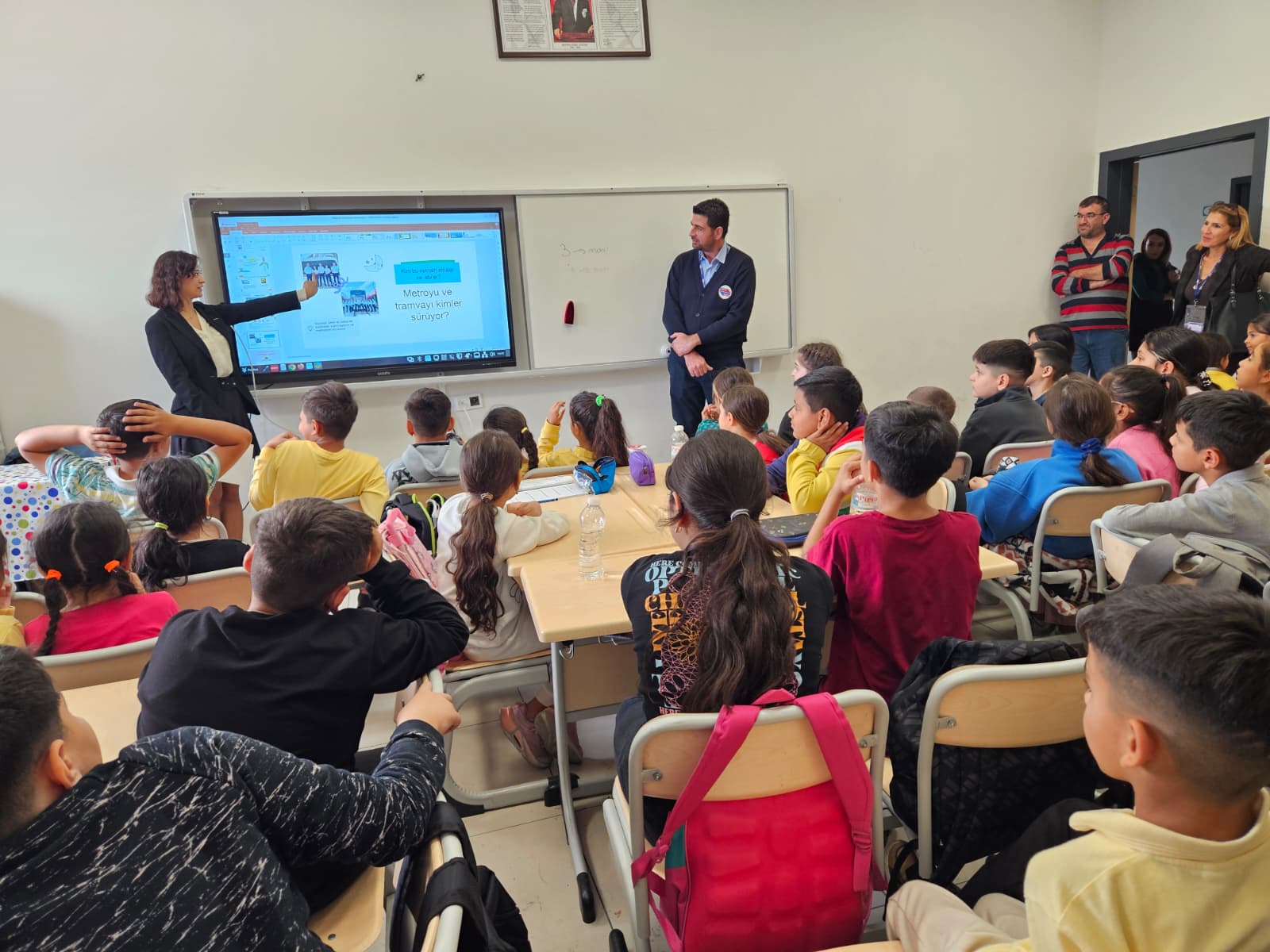 “Gözünüz Metro ve Tramvayda Olsun” başlıklı sunumda metro ve tramvayı kimlerin kullandığı, araçlara biniş kuralları ve yolculuk sırasında dikkat edilmesi gereken güvenlik adımları öğrencilere aktarıldı.