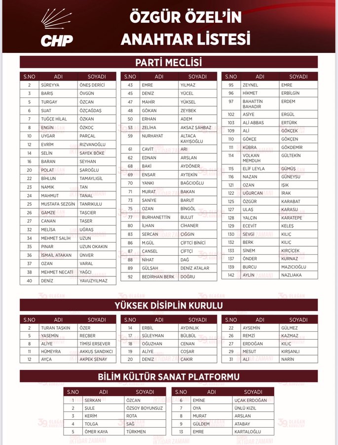 Özel’in oluşturduğu anahtar liste, partide süreklilik ve yenilenme dengesini gözler önüne serdi. Mevcut Parti Meclisi’ndeki 49 ismin korunduğu listede, 31 yeni isim partinin üst yönetimine katılıyor. Listede dikkat çeken diğer isimler arasında: