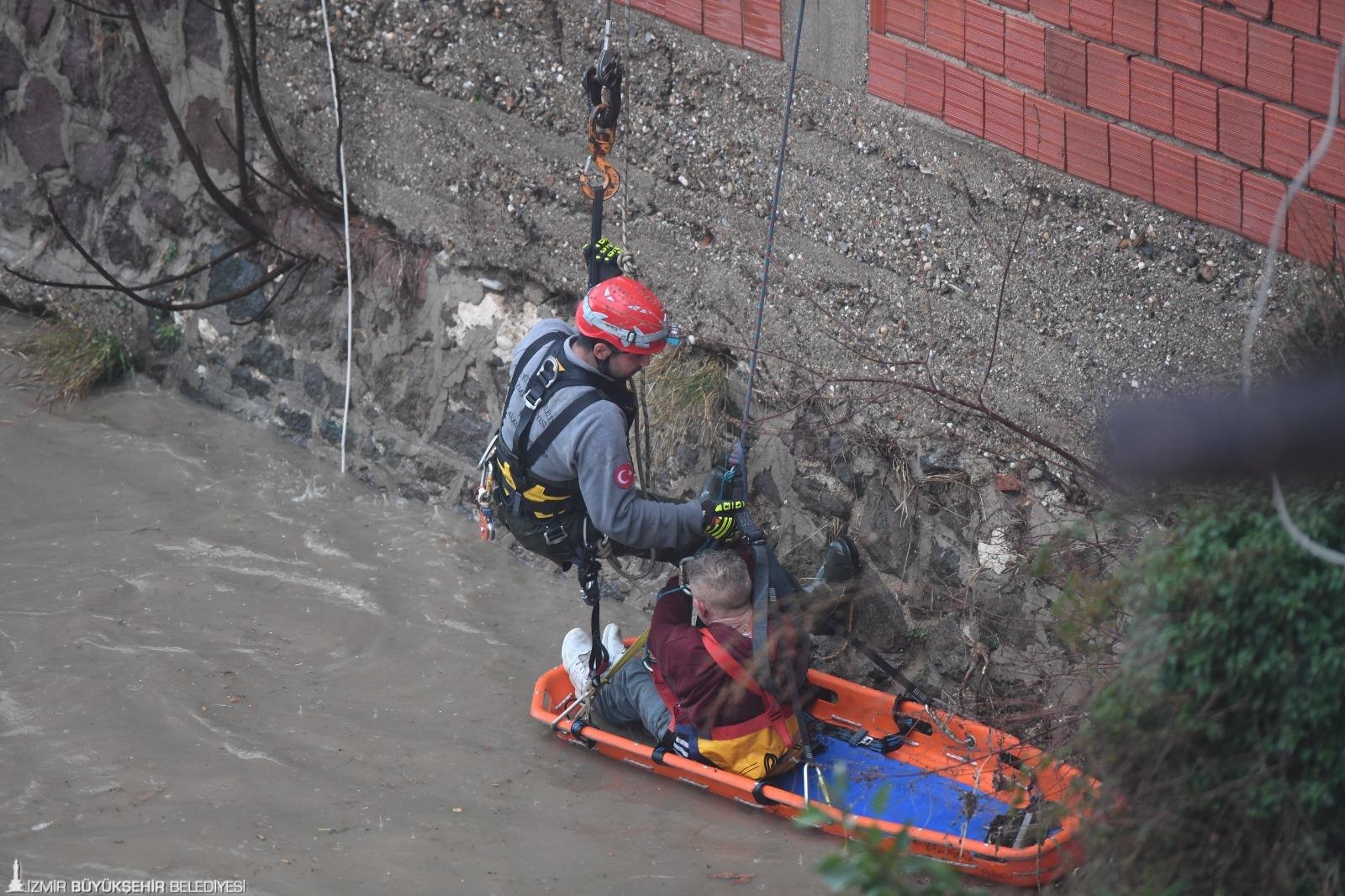 Yaklaşık 20 metre sürüklenen kişiyi tutunduğu noktada, ihbar üzerine olay yerine gelen İzmir Büyükşehir Belediyesi İtfaiye Dairesi Başkanlığı ekipleri kurtardı.