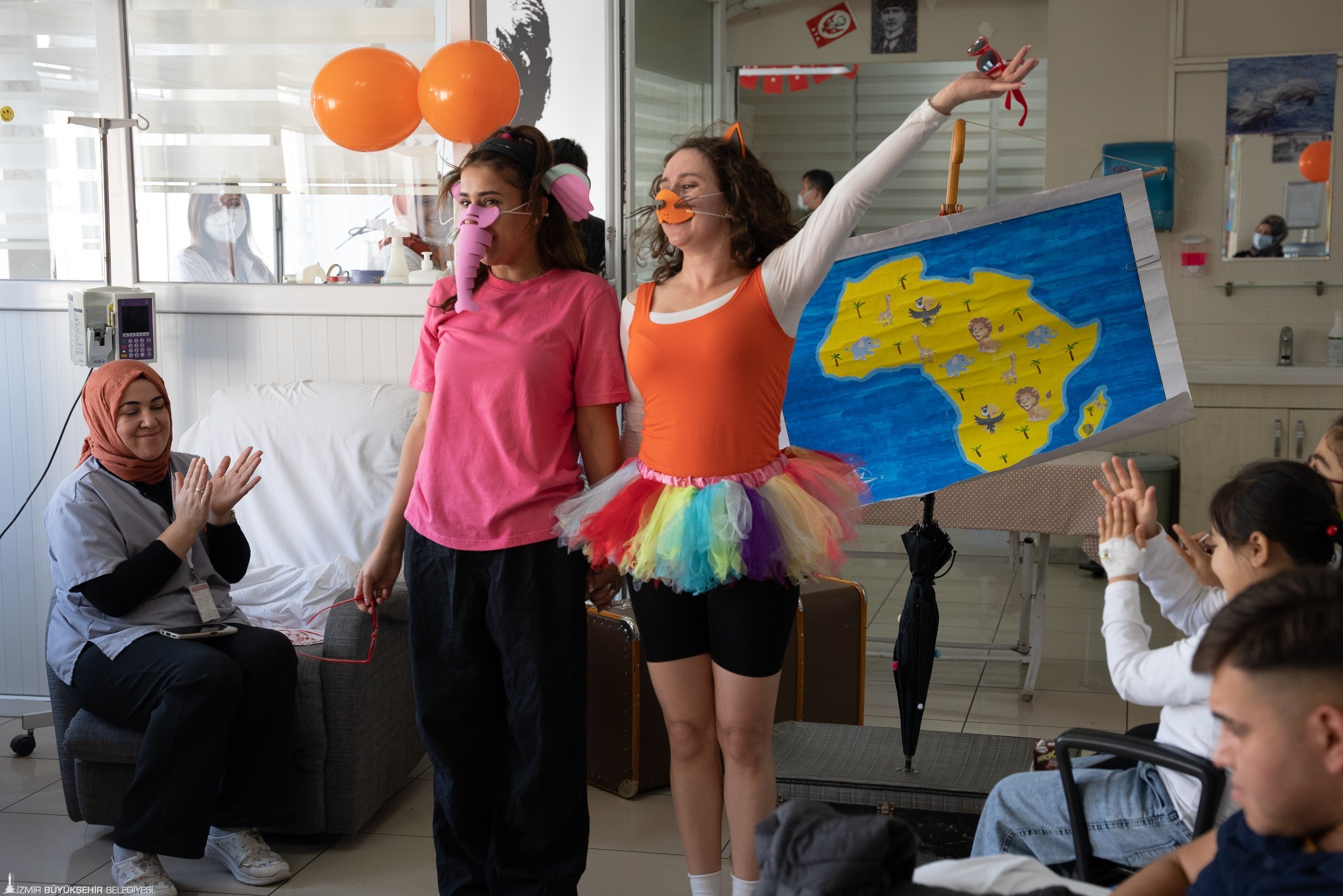 İzmir Büyükşehir Belediyesi Şehir Tiyatroları (İzBBŞT) onkoloji servislerinde tedavi gören çocuklara moral vermek ve sanatla iletişimlerini güçlendirmek için başlattığı “Sanat İyileştirir” projesi kapsamında ziyaretlerini sürdürüyor.