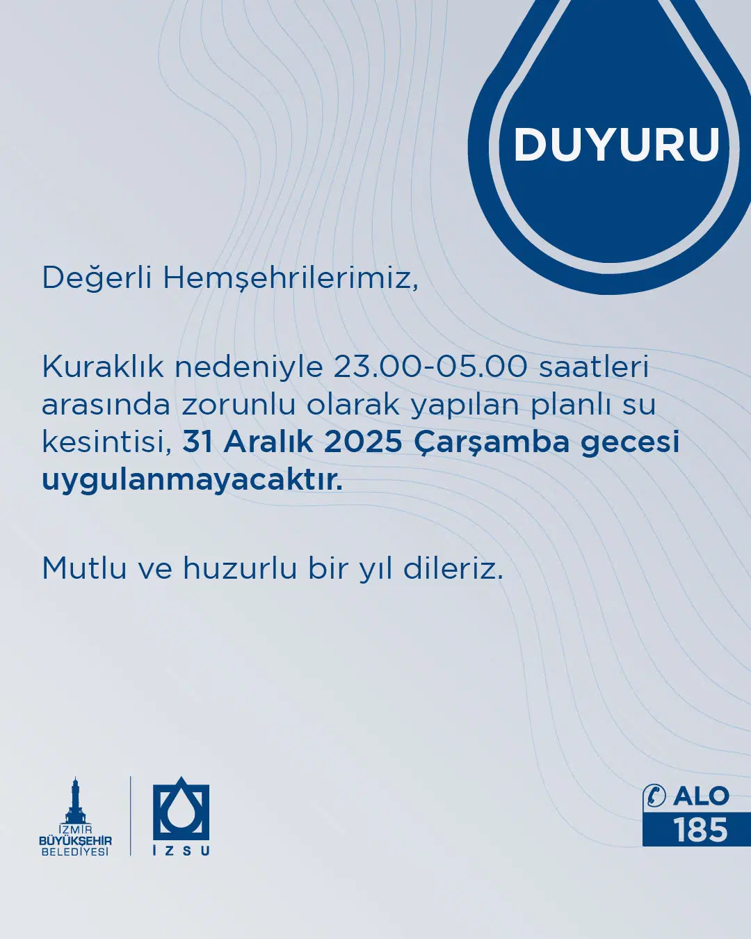 İZSU’dan yapılan resmi bilgilendirmeye göre; Konak, Karabağlar, Çiğli, Karşıyaka, Balçova, Narlıdere, Güzelbahçe, Buca, Bayraklı, Bornova, Menemen, Gaziemir ve Menderes ilçelerinde yaşayan vatandaşlar, 31 Aralık gecesi su kesintisiyle karşılaşmayacak. Normal takvimde her gece saat 23.00’te başlayan ve sabah 05.00’e kadar süren uygulama, 1 Ocak sabahına kadar askıya alınmış durumda.